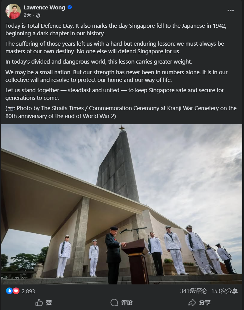 黄循财在当天的贴文中表示:今天是全面防卫日。这也标志着新加坡年落入日本手中的一天,开启了我们历史上的黑暗篇章。当年的苦难岁月给新加坡留下了沉重而深刻的教训。“我们必须时刻掌握自己的命运。除我们自己以外,没人会替我们保卫新加坡。”